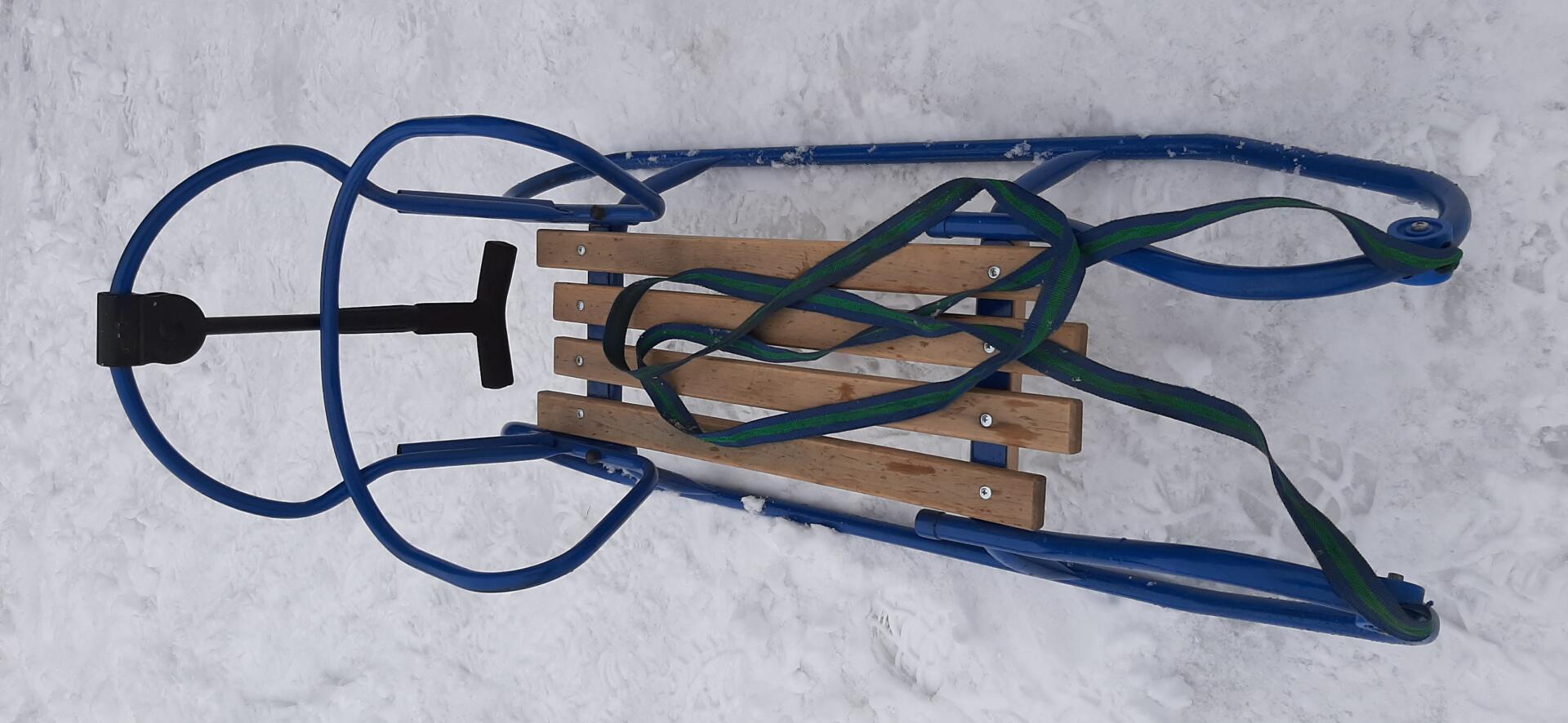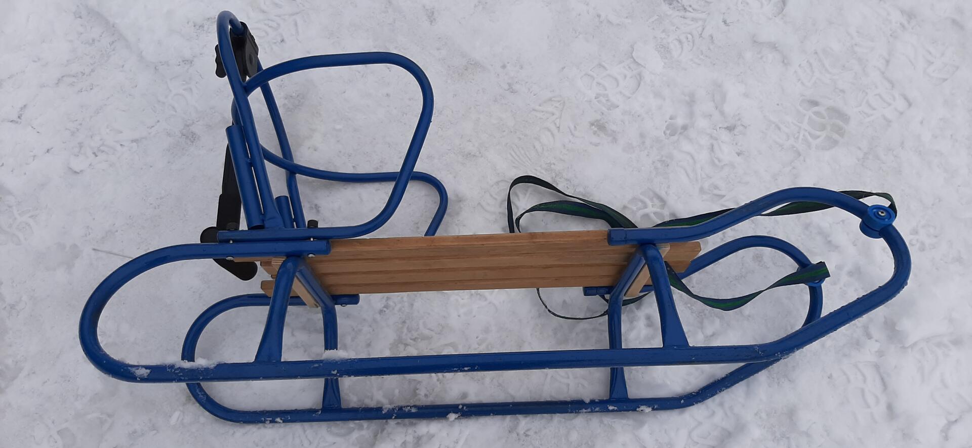 Jest nareszcie prawdziwa zima więc mam prawie nowe metalowe sanki które to posiadają odpinane oparcie oraz zamontowany jest też pchacz który to pomaga w sterowaniu sankami będąc z tyłu pociechy siedzącej przed nami , więc dziecku nie będziemy przeszkadzali w podziwianiu zimowej aury z przodu , jest również taśma do ciągnięcia sanek